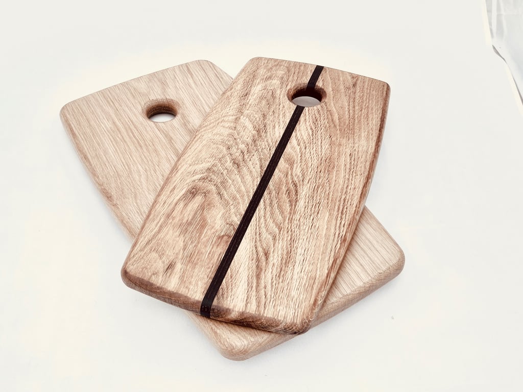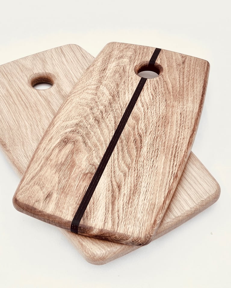 English Oak & American Walnut chopping board, These are finished with beeswax and food grade mineral oil. The board comes with a Bjorn Weird wallhanger so they can stored without cluttering work surfaces.