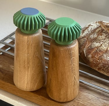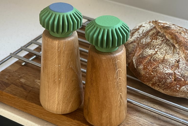 It is handmade on the lathe from solid single-piece oak. Each mill has a ceramic grinder mechanism and a PLA top. Colours will change but current set are Matcha green.