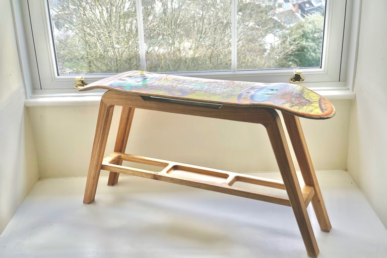 The Deck Chair is a multipurpose piece made from solid oak and a used skateboard deck. The piece is the perfect height to be used as a computer seat, bench, footstool, coffee table or step